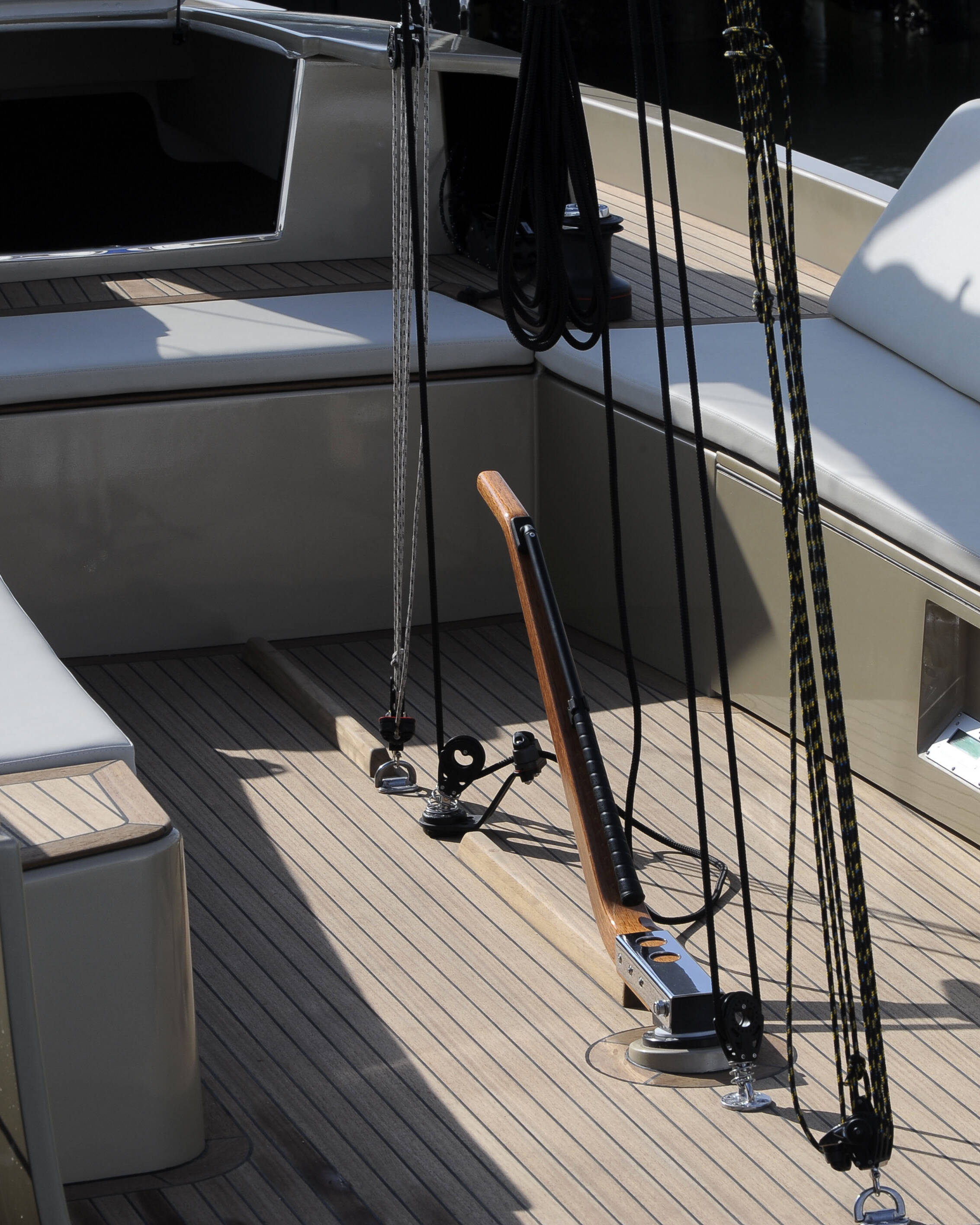 À bord, le luxe se vit dans les détails. Les matériaux nobles — bois clair, cuir souple, acier poli — dialoguent avec la lumière. La cabine propriétaire et celle des invités s’ouvrent sur un intérieur sobre et lumineux, au style résolument contemporain. Un yacht pensé comme un appartement design posé sur l’eau.